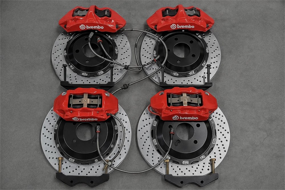Четырёхпоршневой суппорт имеет высокую жёсткость корпуса и равномерно прижимает колодку по всей площади что обеспечивает ровное стабильное замедление при любых режимах. Вентилируемые диски эффективно снижают температуру и уменьшают риск теплового провала. Система сохраняет одинаковый характер торможения даже при серии интенсивных остановок что особенно важно на тяжёлых или форсированных автомобилях.